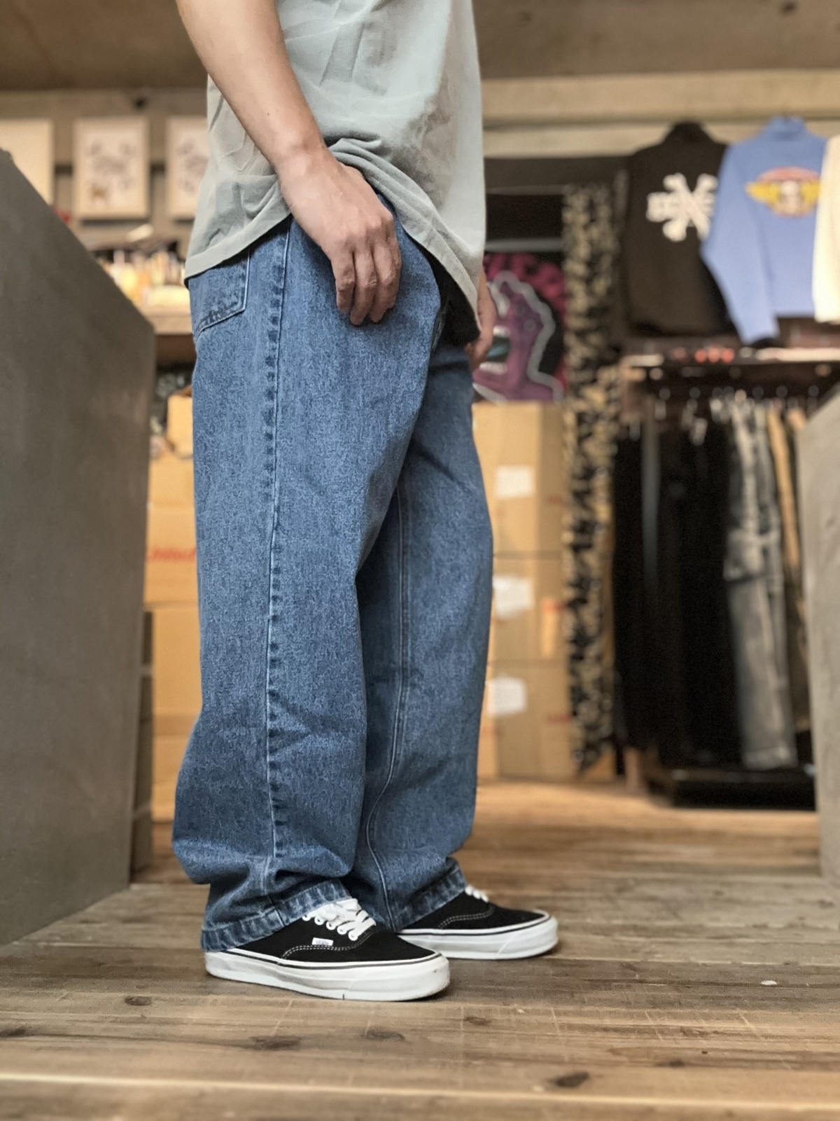 14ozのしっかりとしたデニム生地を使用した太過ぎないバギーシルエットのデニムパンツ。丈も程よい長さに仕上げ、エンボスレザーパッチ、コインポケットにブランドロゴ刺繍入り。インディゴ、ブラック共にストーンウォッシュ仕上げ。
